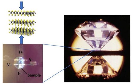 為此,中科院研究人員在自主搭建的高壓綜合測試平臺上,利用金剛石對頂砧產生的超高壓條件,通過低溫電輸運測量發現:二硫化鉬在90GPa(90萬大氣壓)左右的壓力條件下變成超導體,在130~220 GPa(接近地球外核壓力)壓力范圍內,超導轉變臨界溫度可高達12K,并通過密度泛函理論計算解釋了超導出現的微觀機制。