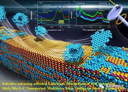 通過摩擦界面微區分析發現,TMD/DLC復合薄膜體系的自適應性受非潤滑相被選擇性轉移出接觸表面的演變過程影響顯著:在摩擦化學反應中,潤滑相的定向有序化程度決定了薄膜的低摩擦系數,非潤滑相的選擇性轉移程度決定了薄膜的低磨損率。同時,自適應復合薄膜微納結構與選擇性轉移行為之間亦存在明顯關聯,(002)晶面取向擇優的MoS2富集層非常有利于薄膜在真空及干燥氣氛中快速形成二維層狀結構高度定向有序的TMD轉移膜(圖1),使薄膜磨合時間明顯縮短,該工作為優化潤滑相與非潤滑間不同摩擦化學反應的協同效應提供了技術支持。相關研究結果發表在ACS Appl. Mater. Interfaces.7 (2015) 12943-12950, J. Phys. D: Appl. Phys. 48 (2015) 175304,Surf. Coat. Technol.296 (2016) 185-191, Appl. Surf. Sci. 364 (2016) 249-256, Sci. Rep.6 (2016) 25378, Fusion Eng. Des. 104 (2016) 40-45, 摩擦學學報. 36 (2016) 1-6, Appl. Surf. Sci.406 (2017) 30-38以及Phys. Chem. Chem. Phys. 19 (2017) 8161-8173等期刊,并被Phys. Chem. Chem. Phys.選為2017年19期封底
