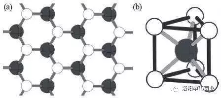 (單層二硫化鉬具有二院蜂窩狀晶格。其中硫原子和鉬原子交替穿插形成六方子晶格,如圖a所示,而每個鉬原子占據由6個硫原子形成的三棱柱的中心,如圖b所示)