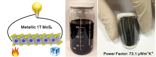 在該工作中,黃暉輝副教授及其合作者采用化學剝離技術大量地制得了1T相二維二硫化鉬S2,通過對材料結構的改造而非外加電場的方法調節了其載流子濃度,所制得的柔性熱電材料的常溫功率因子達到73.1 μWm-1K-2,超過了多壁碳納米管等已知的大多數柔性熱電材料體系。