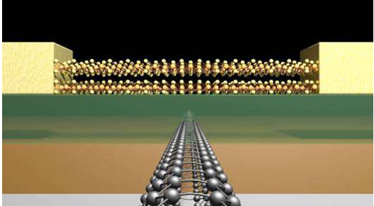 一旦選定好二硫化鉬作為半導體材料,接下來要做的就是構建柵極。要做出一個1納米寬的柵極可不是件容易事,傳統的光刻技術不適用于如此小的尺度,因此研究人員選擇了碳納米管——一種直徑1納米左右的空心圓柱——用作柵極。