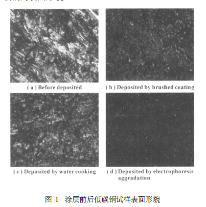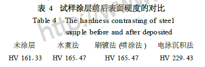 以上分析表明,電泳法涂層的強度大,電泳法可以提高表面硬度,從而提高試樣的耐磨性,而且通過測定摩擦因數表明,電泳法得到的涂層的摩擦因數小,因此電泳法優于其它2種方法。但是電泳法依然存在不足,如電泳法只能在一個表面形成涂層,無法在試樣整體形成均一的涂層,這方面就不如刷涂法和水煮法。