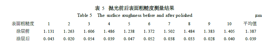 機械結合是二硫化鉬涂層的主要形成方式。當二硫化鉬分子與基體接觸時,由于基體表面比較粗糙。二硫化鉬分子就會沉積在由于表面粗糙而形成的表面微凸體上,從而形成機械結合。機械結合的強度主要取決于表面的粗糙程度。為了驗證上述結論,本文作者采用不同預處理方法的低碳鋼基底材料進行了涂層實驗。首先,對低碳鋼進行砂紙打磨,去掉表面氧化層,再用拋光機進行拋光處理,然后采用上述3種涂層方法在試樣表面涂覆二硫化鉬涂層,并測出涂覆前后試樣的表面粗糙度,結果見表5。