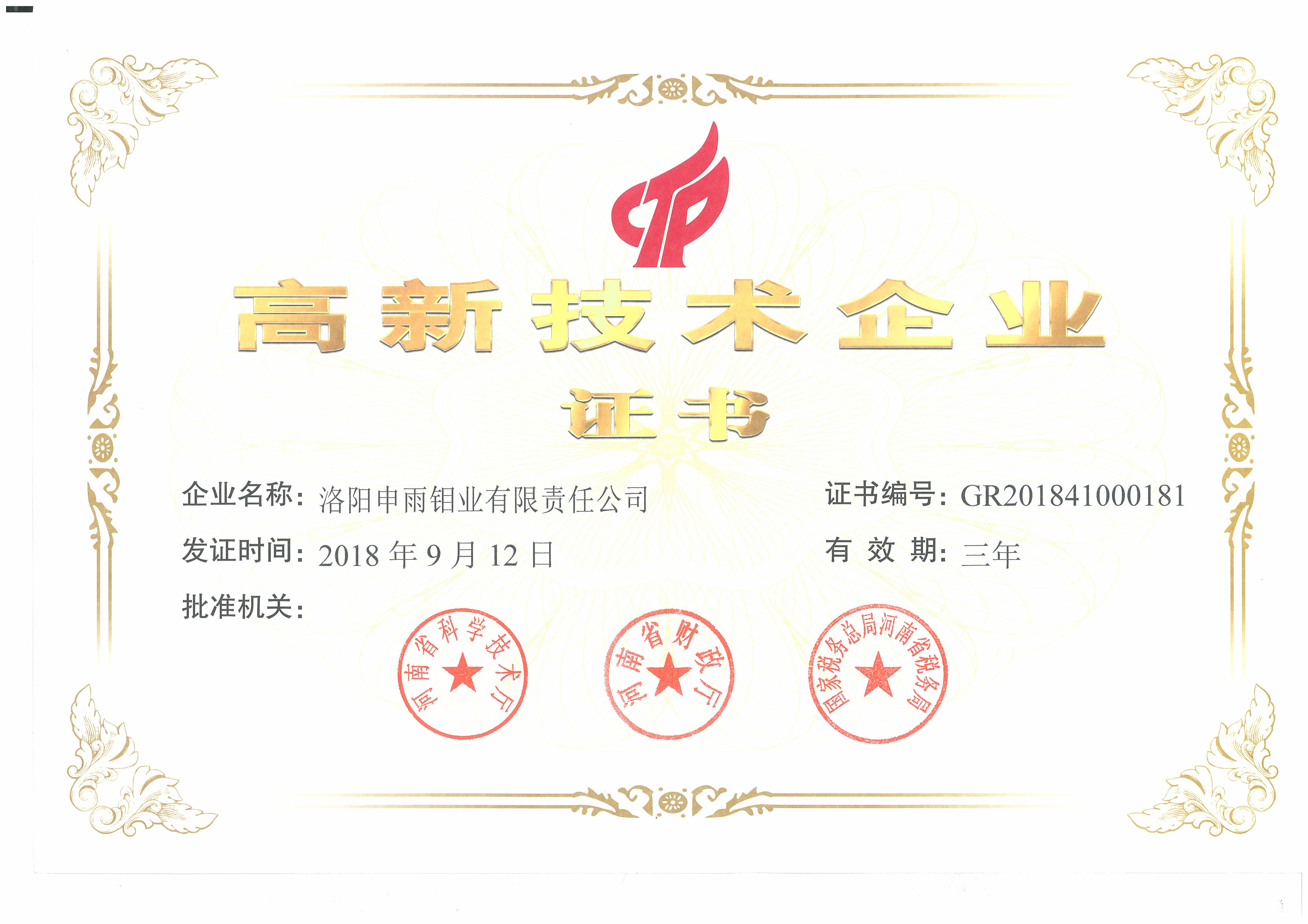 高新技術企業不僅是一種榮譽,更是一種責任,這一證書的獲得,既是對洛陽申雨鉬業高端技術開發能力、科技成果轉化能力、自主知識產權的高度肯定和認可,同時也是對申雨人的激勵和鞭策,必將持續激發我們的創新熱情,進一步提高企業的產品質量和經營效率。